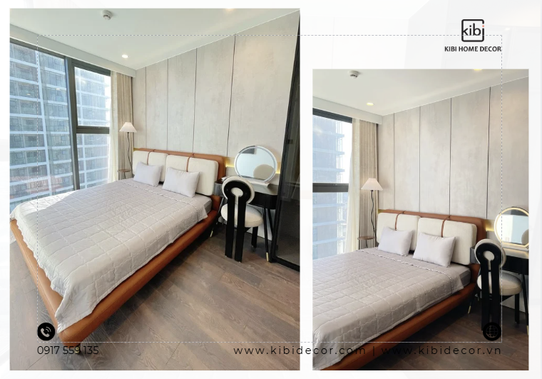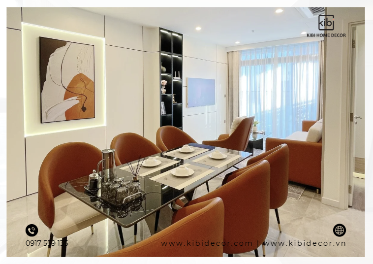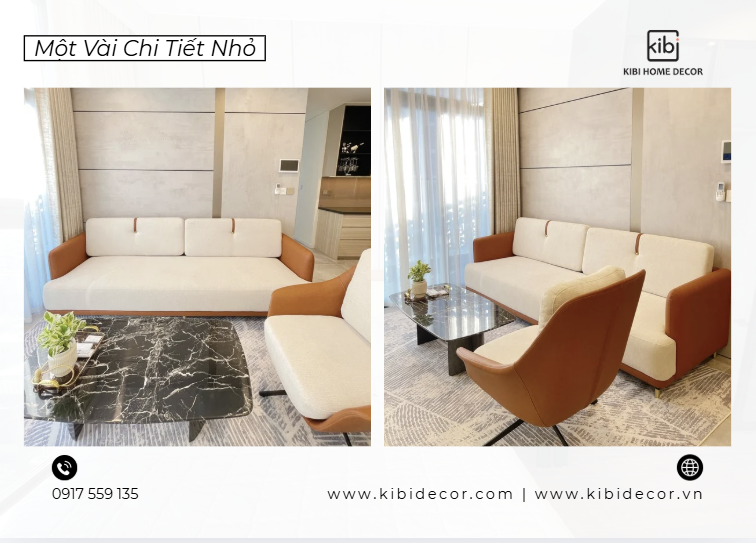 Toàn bộ nội thất trong căn hộ – Từ sofa, bàn trà, bàn ăn, ghế ăn cho đến tranh treo tường, giường ngủ, bàn trang điểm và các món decor – Đều được KiBi lựa chọn và hoàn thiện theo một ngôn ngữ thiết kế thống nhất. Đặc biệt, bộ sofa nỉ phối da là điểm nhấn quan trọng của không gian phòng khách.